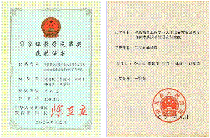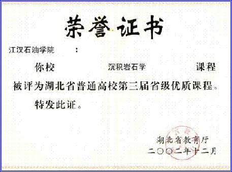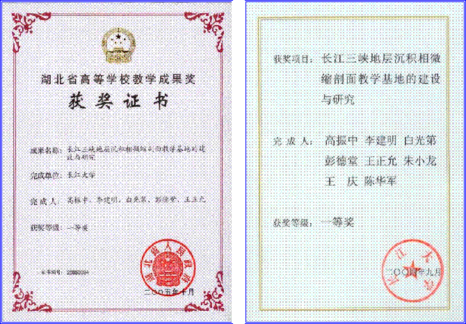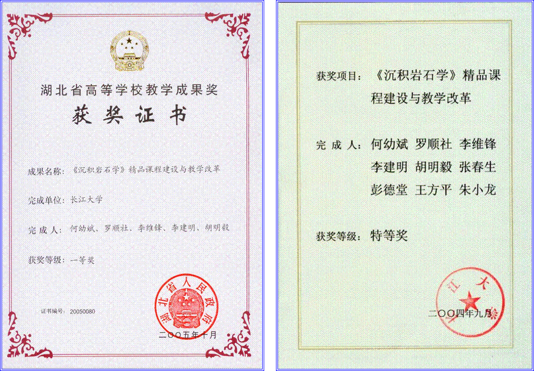 近五年来,课程建设小组教师积极开展教学研究,不断改革教学方法,提高教学质量。先后有 7 人次获得校级教学质量优秀奖, 1 人次获得系级教学质量优秀奖。 2001年,“资源勘查工程专业人才培养方案及教学内容体系改革的研究与实践”获国家级高等教育教学成果二等奖。 2002年,《沉积岩石学》被评为湖北省普通高校第三届省级优质课程,2003年被评为省级精品课程。 2004年,“资源勘查专业本科优秀生培养模式研究与实践”获长江大学教学成果一等奖,2005 年获省级三等奖。 2004年,“沉积岩石学精品课程建设与教学改革”获长江大学教学成果特等奖,2005 年获省级一等奖。 2004年,“长江三峡地层沉积相微缩剖面教学基地建设与研究”获长江大学教学成果一等奖,2005 年获省级一等奖。