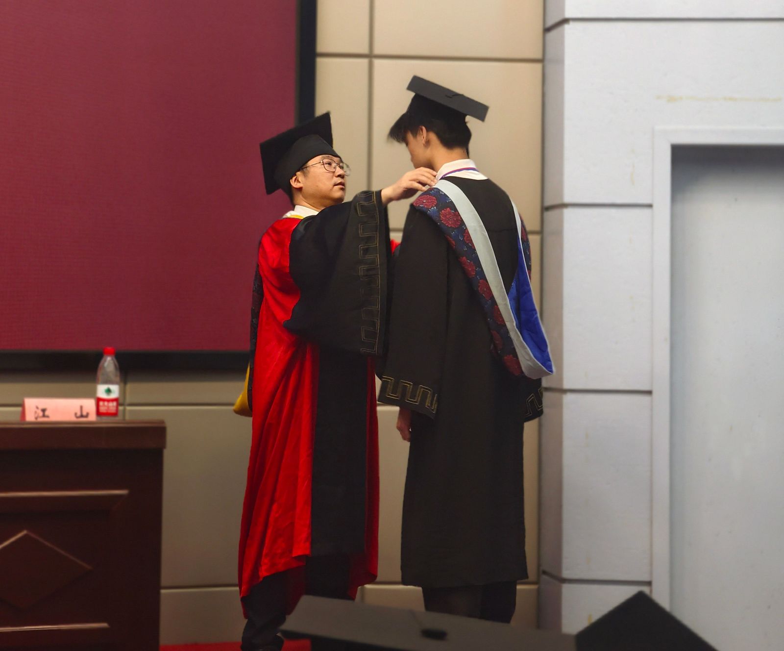 伴随着热烈的掌声,导师代表依次上台就坐。台下300多名毕业生身着学位服,神采奕奕,眼神中满载着对未来的憧憬。授予仪式正式开始,由胡忠贵副院长宣读学位授予文件,江山副院长为同学们正冠,朱光有院长为每位获得学位的同学颁发学位证书,拨穗并合影留念。毕业生以自豪和激动的心情接过学位证书。这薄薄的一纸证书,承载着同学们数年如一日的努力和坚持。整场仪式在庄重而温馨的氛围中圆满完成。