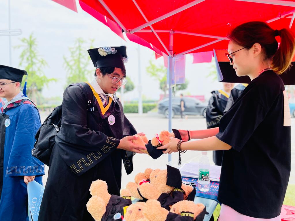 会场外,学院精心组织毕业生感恩礼活动,同学们填写问卷,写下对母校的美好祝愿和深情感谢,一个个身着学士袍的小熊玩偶、一张张2138cn太阳集团学生原创设计的鼠标垫、印有学院元素的帆布包,寄托着学院对毕业生“前程似锦,一路生花”的殷切期盼。