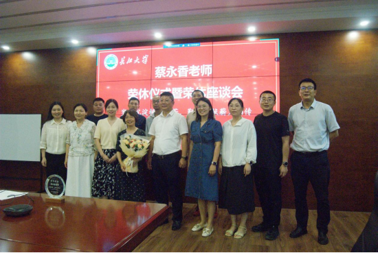 最后,副院长胡忠贵为蔡永香副教授颁发荣休纪念牌,学生代表献上鲜花,并合影留念,桃李满天下,秋菊溢芳馨,祝蔡永香教授荣休快乐,幸福安康!