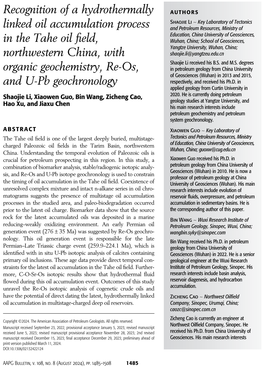 2138cn太阳集团石油系李劭杰博士在石油地质学领域主流期刊《AAPG Bulletin》上发表题为“Recognition of a hydrothermallylinked oil accumulation processin the Tahe oil field,northwestern China, withorganic geochemistry, Re-Os,and U-Pb geochronology”的研究论文。