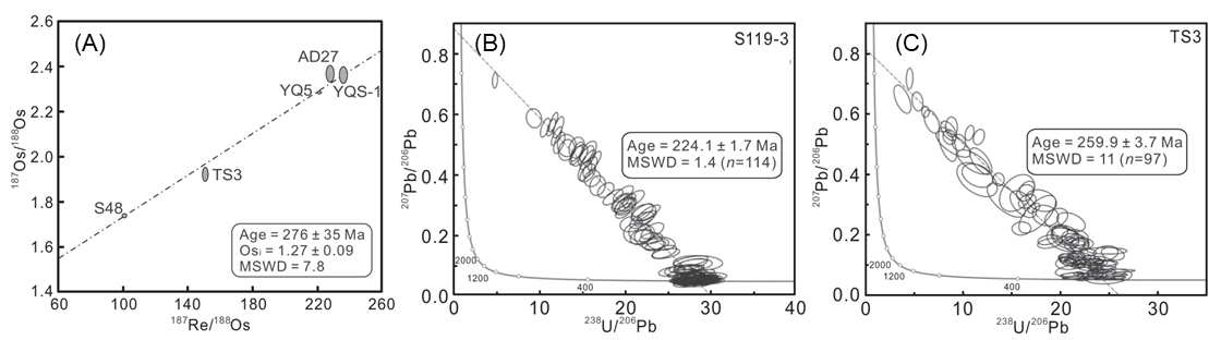 图1(A)塔河油田奥陶系原油Re-Os定年结果; (B)塔河油田奥陶系方解石脉体I原位U-Pb定年结果; (C)塔河油田奥陶系方解石脉体II原位U-Pb定年结果.