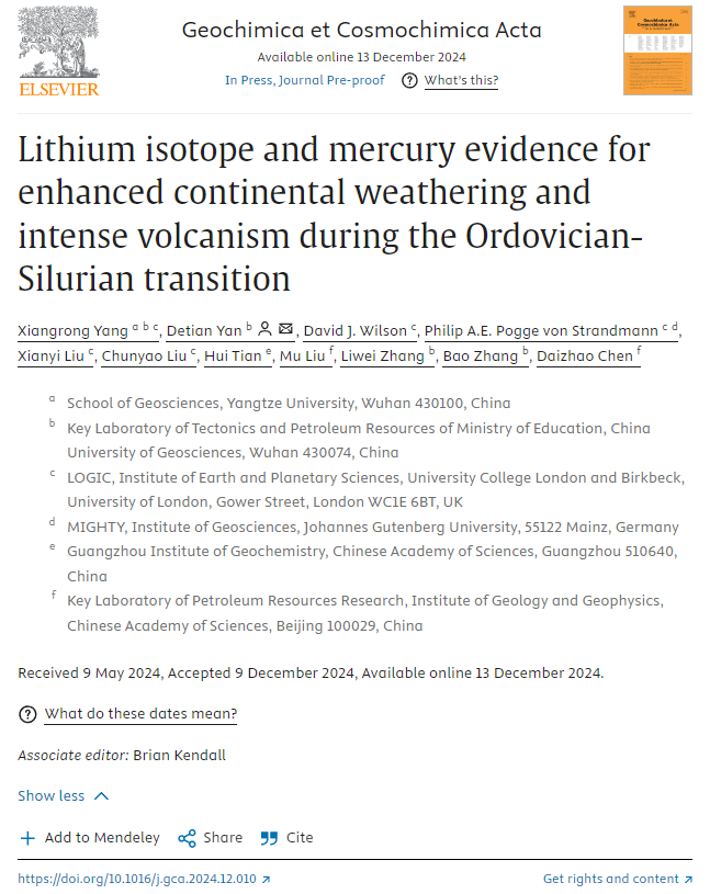 (通讯员:许可)奥陶纪−志留纪转折期全球古气温、生物群类型、古海洋海平面和古海洋水化学条件等都发生了巨大的转变。重建晚奥陶世时期的古气候条件,探究极端气候事件的成因机制,并揭示极端气候影响下的环境、生物演化关系一直是地球科学领域的热点与前沿。因此,厘清奥陶纪-志留纪转折期大陆风化作用和火山活动对厘清这一时期的气候-海洋-生物演化机制具有重要意义。