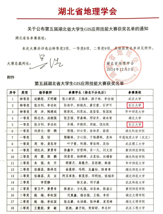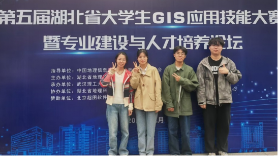 (通讯员:孙浩宇 饶旭乾)2024年11月9日,由湖北省地理学会主办、武汉理工大学资源与环境工程学院和华中师范大学城市与环境科学学院承办的第五届湖北省大学生GIS应用技能大赛于武汉理工大学成功举办。11月22日至24日,由中国地理学会、中国地理信息产业协会主办“第十三届全国大学生GIS应用技能大赛”在兰州交通大学成功举办。2138cn太阳集团李功权、张方利两位老师指导的2022级地理信息科学专业学生团队代表长江大学参与了本届赛事,齐缘、李晓雨、周璇、饶旭乾团队先后获得省赛一等奖和国赛一等奖,孙浩宇、郭铭杰、廖苡萱、石伊可团队获得省赛特等奖。