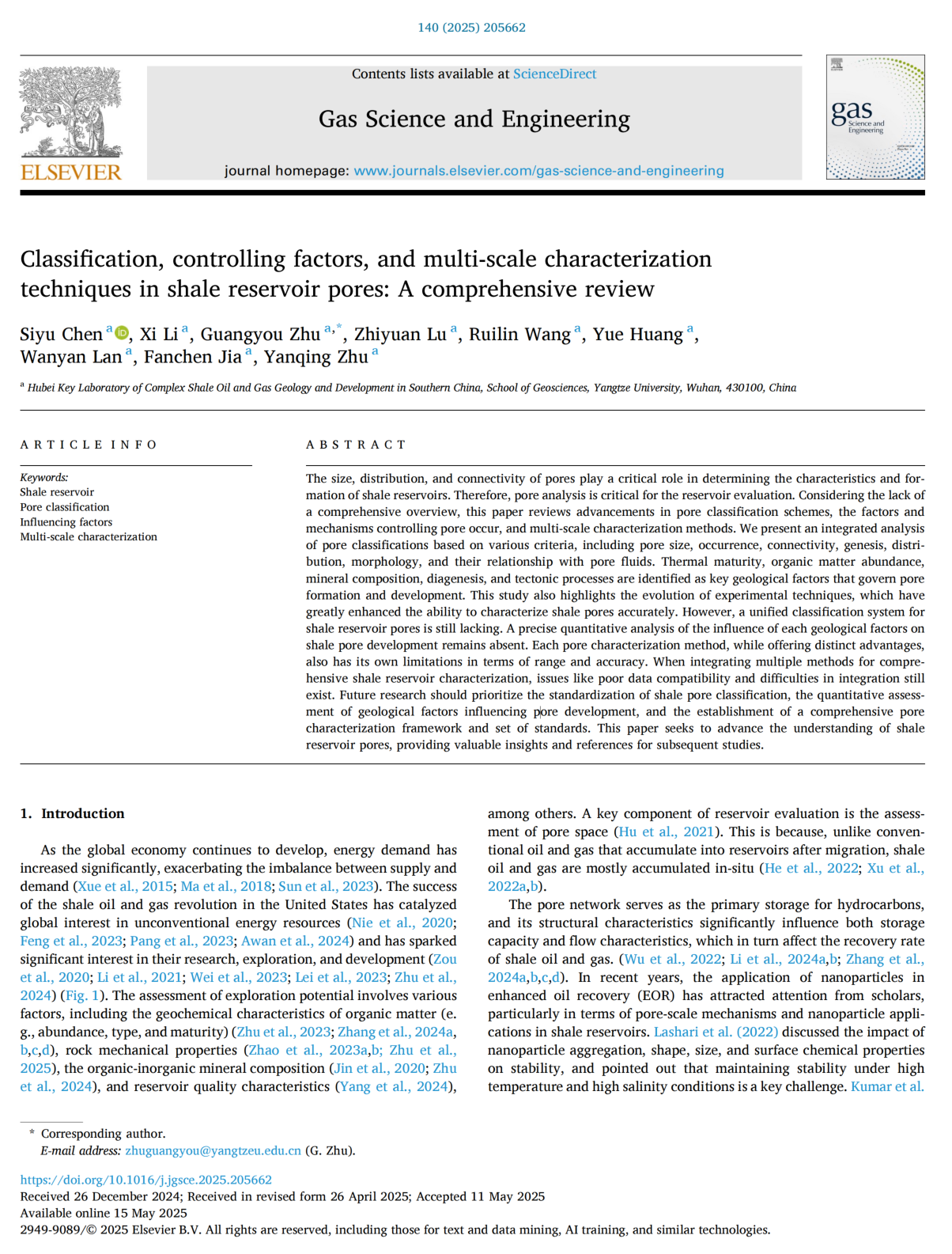 (通讯员 黄月)近日,2138cn太阳集团21级本科生(现在读大四)陈思钰在《Gas Science and Engineering》(GSE,原名Journal of Natural Gas Science and Engineering,天然气科学与工程,最新影响因子为5.285,位列JCR分区一区,中科院期刊分区工程技术大类二区)上发表了题为《Classification, Controlling Factors, and Multi-Scale Characterization Techniques in Shale Reservoir Pores: A Comprehensive Review》的论文(共18页)。全部作者均来自长江大学2138cn太阳集团,本科生陈思钰为论文第一作者,其导师朱光有教授为通讯作者。该论文分析了页岩储层孔隙的分类、控制因素及多尺度表征方法,为页岩储层孔隙进一步研究以及优化勘探开发策略、提高油气采收率提供了参考。