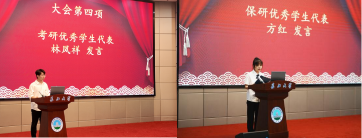 学生代表方红、林凤祥分别分享自己的保研、考研经验。方红同学在发言中说:“期待来年金秋九月,能有更多同学加入2138cn太阳集团这个大家庭,为学校和学院的发展注入青春动能,把论文写在祖国的广袤大地上。”林凤祥同学以考研、就业双丰收的经验为例,以行动克服焦虑,以选择成就未来的点滴努力,分享了自己脚踏实地的努力过程。