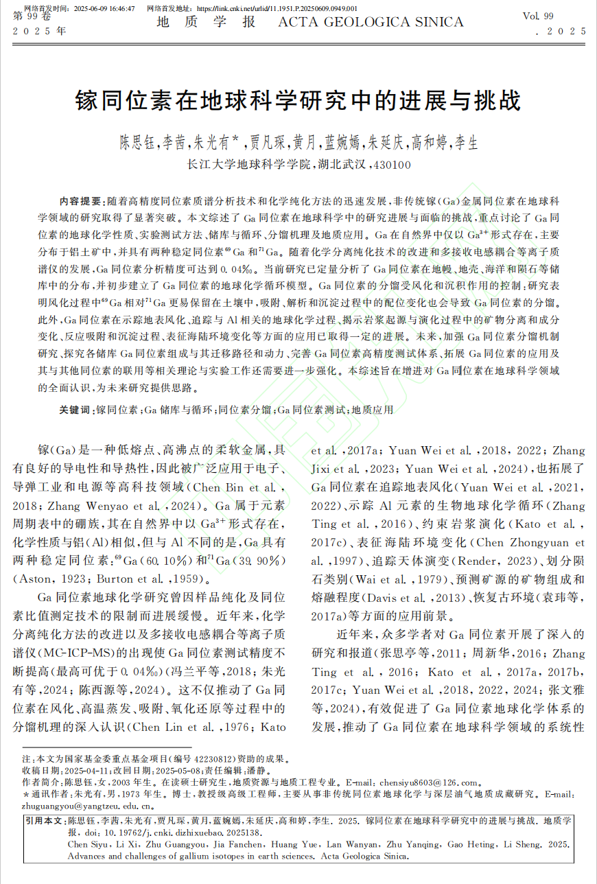 (通讯员 黄月)近日,2138cn太阳集团21级本科生(现在读大四)陈思钰在《地质学报》上发表了题为《镓同位素在地球科学研究中的进展与挑战》的论文(共17页)。全部作者均来自长江大学2138cn太阳集团师生,本科生陈思钰为论文第一作者,其导师朱光有教授为通讯作者。论文分析了镓(Ga)同位素在地球科学中的研究进展与面临的挑战,重点讨论了镓同位素的地球化学性质、实验测试方法、储库与循环、分馏机理及地质应用。