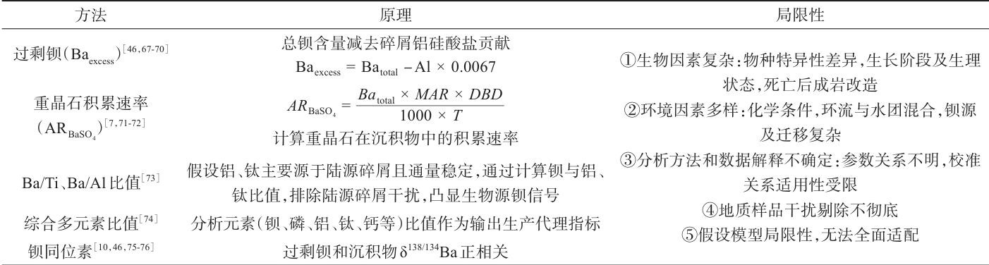 在古生产力重建方面,论文梳理了当前主流方法的原理与局限:过剩钡法、重晶石积累速率法、元素比值法及新兴的钡同位素法均面临生物因素复杂性、环境干扰及模型不确定性等挑战(表1)。研究指出,钡与有机碳的强正相关耦合关系为精准示踪古生产力提供了新路径,但需结合钡同位素分馏特征剔除非生物信号干扰。