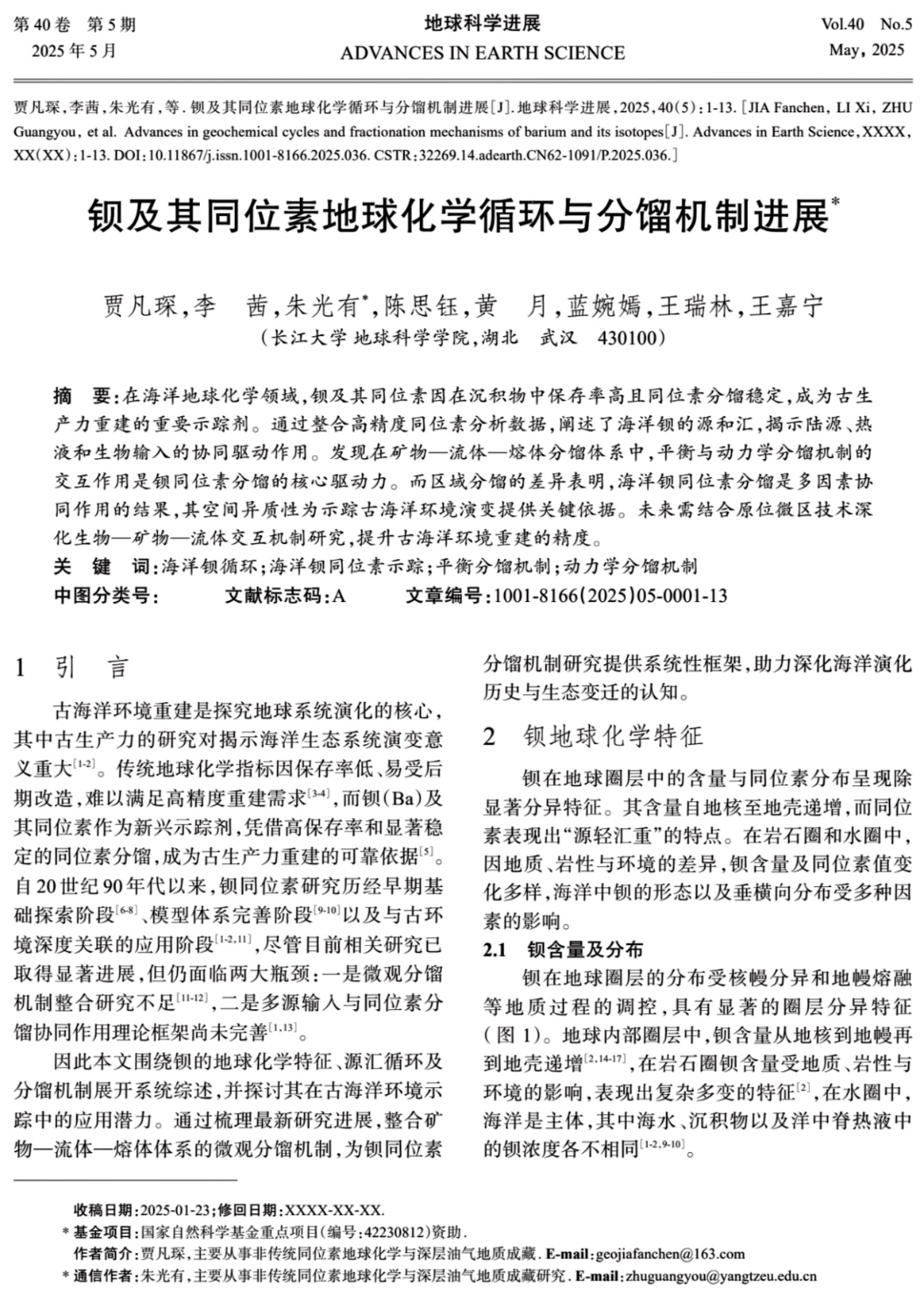 (通讯员 蓝婉嫣)近日,2138cn太阳集团21级本科生(现在读大四)贾凡琛在核心期刊《地球科学进展》上发表了题为《钡及其同位素地球化学循环与分馏机制进展》的论文(图1,共13页)。全部作者均来自长江大学2138cn太阳集团师生,本科生贾凡琛为论文第一作者,其导师朱光有教授为通讯作者。论文分析了钡(Ba)同位素在地球科学中的研究进展与面临的挑战,重点讨论了钡同位素的地球化学性质、储库与循环、分馏机理及古生力指示方面的应用。