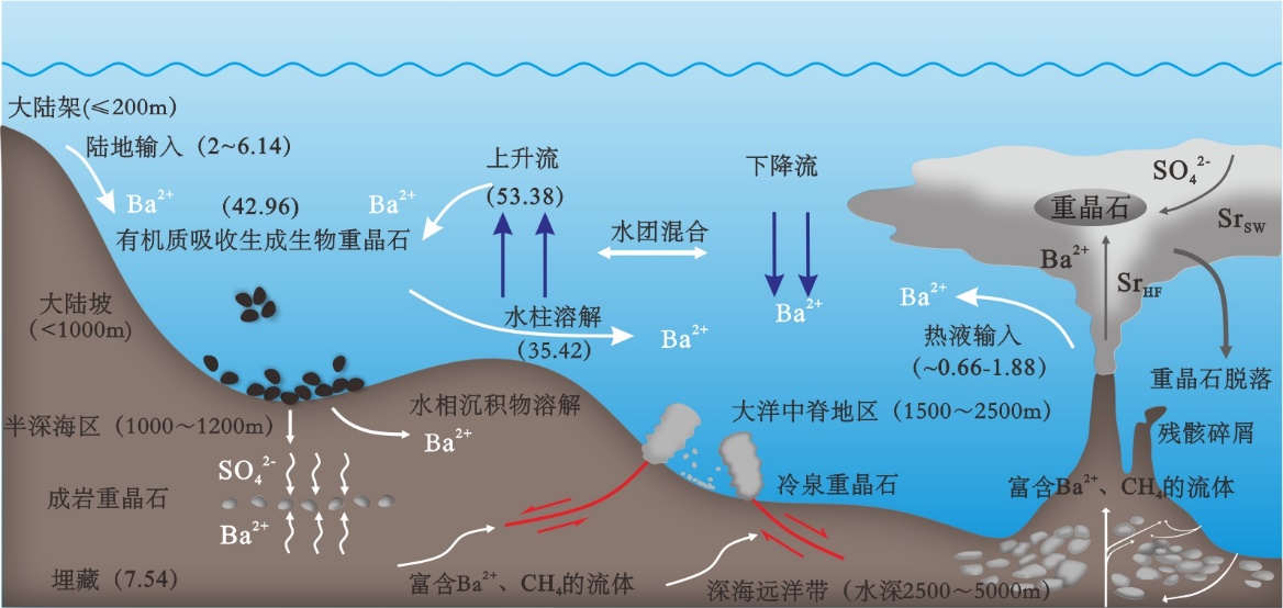 本文基于钡元素及其同位素的地球化学特征,系统阐述了钡在地球各圈层的储库分布与循环机制:海洋钡循环受陆源输入、热液活动及生物过程协同驱动—生物代谢释放形成动态“源”,陆源与热液物质沉降埋藏形成“汇”,源与汇的动态切换维持了钡循环的持续运转(图2)。研究进一步揭示,重晶石作为钡的主要汇聚形式,可分为沉积型和成岩型,其形成机理、通量及分布特征为示踪古环境提供了关键依据(图3)。