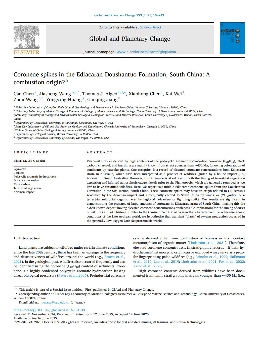 (通讯员 卢志远)2138cn太阳集团特任教授陈粲在《Global and Planetary Change》上发表题为“Coronene spikes in the Ediacaran Doushantuo Formation, South China: A combustion origin?”的论文,长江大学南方复杂页岩油气地质与开发湖北省重点实验室为论文第一署名单位,特任教授陈粲为第一作者。