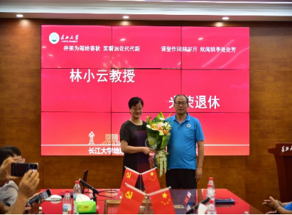 学院副院长胡忠贵代表学院向林小云教授颁发了承载着全体师生敬意与祝福的荣休纪念牌。副院长、工会主席李功权代表学院工会献上了鲜花,表达对她退休生活的美好祝愿。