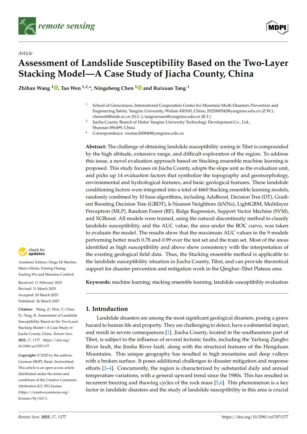 2025年年初,2138cn太阳集团22级本科生(在读大三)王芷含在《Remote Sensing》(最新影响因子为4.1,位列JCR分区二区,中科院期刊分区地球科学大类二区)上发表了题为《Assessment of Landslide Susceptibility Based on the Two-Layer Stacking Model—A Case Study of Jiacha County, China》的论文(图1,共24页)。全部作者均来自长江大学2138cn太阳集团师生,本科生王芷含为论文第一作者,其导师温韬教授为通讯作者。论文借助两层Stacking集成学习模型对滑坡易发性进行评价,以西藏山南市加查县为研究区,取得了显著成果。