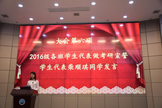 大会第六项,2016级各班学生代表做考研宣誓,将会场的气氛带到高潮,各班同学代表逐一宣誓、为班上同学加油打气,台下同学纷纷激动鼓掌。随后,由2016级学生代表柴顺琪发言,她鼓励大家道:“考研是一场自己的战斗,我们和其他考生都在同一起跑线上,我们不要妄自菲薄,更不要轻言放弃。我们要珍惜一切时间和机会为考研奋斗,做考研路上的斗士。”