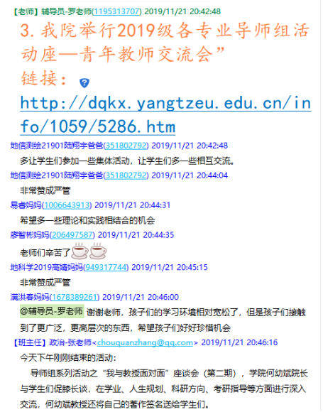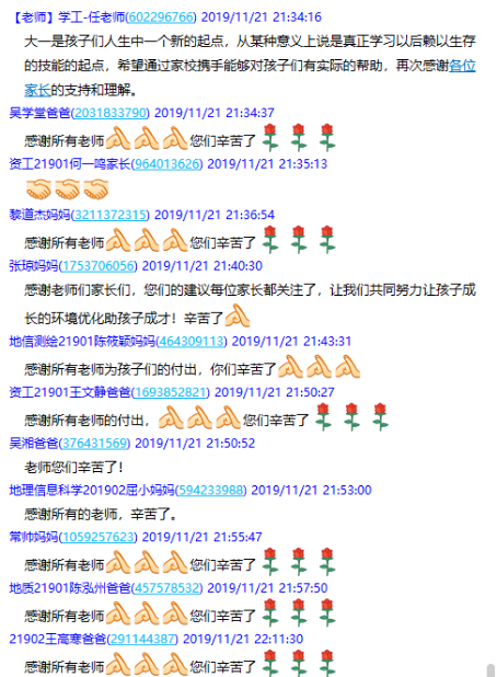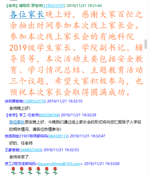 (通讯员罗小玉)11月21日晚19:30,2138cn太阳集团在2019级学生家长群召开了19级本科生第一次线上家长会,此次家长会由年级辅导员罗小玉主持,学院党委副书记任倩、辅导员王宁、潘志远、张严、辅导员助理周寒及255名学生家长共同参与了本次线上讨论。
