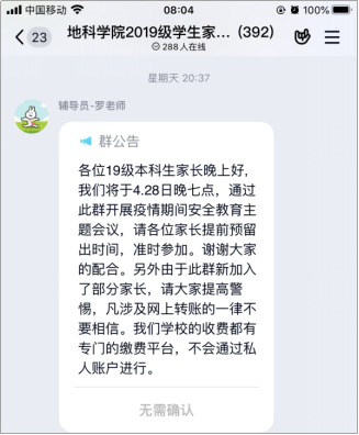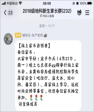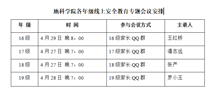 (通讯员 郭霖)为进一步做好常态化疫情防控下学生教育管理工作,使家校联动形成全力,共同保障学生防疫期间居家学习安全。2138cn太阳集团于4月27日~29日分年级召开“疫情期间居家安全教育”专题会议,会议由各年级辅导员主持,学生及家长通过各年级家长QQ群参加,学工办全体老师参会。