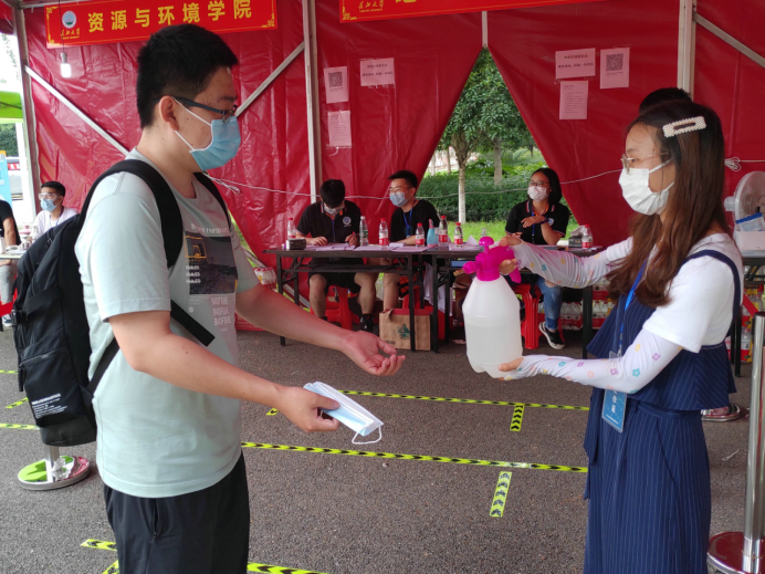 返校毕业生在报到点进行消杀