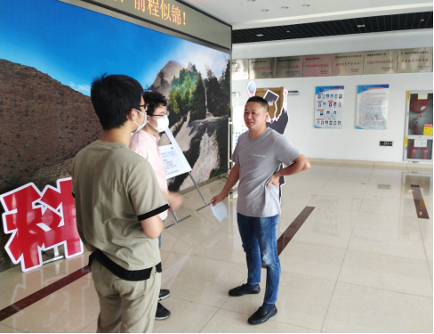 石油科技大楼的学院大厅里,朱正平老师正和地信系的两名毕业生交流着,询问他们关于毕业后的计划、选择,并叮嘱他们既要努力奋斗又要照顾好自己。最后朱老师还表示分别总是难免的,期待同学们的未来更加辉煌、多彩。