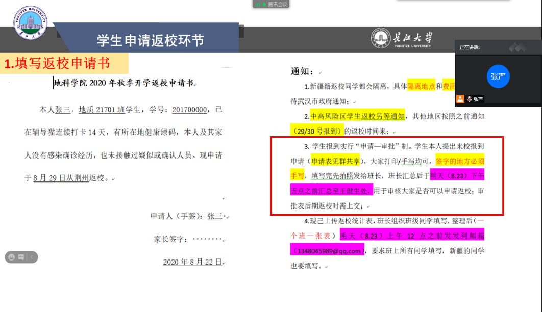 8月22日,2138cn太阳集团分年级利用腾讯会议或雨课堂召开“2020年秋季开学工作”主题班会,会议由各年级辅导员主持,学工办全体老师参会。主题班会开始前,各年级辅导员先以班级为单位,进行点名和签到,确保所有学生和家长到会。主题班会从返校安排、返校前的准备、报到流程、校园管控三阶段和学费缴纳五个方面展开。各年级辅导员为大家重点讲解了分批返校和校园管控三阶段的具体安排,强调了返校前必须的14天连续健康打和按流程返校,并将“申请—审批”制度的具体做法向学生进行了说明。班会最后,各年级辅导员分别就同学们提出的问题或疑惑一一进行了解答。学生和家长纷纷表示本次班会让大家更加全面了解到学校和学院的整体防控工作,也明确了返校前后需要做的准备,是非常必要的会议。