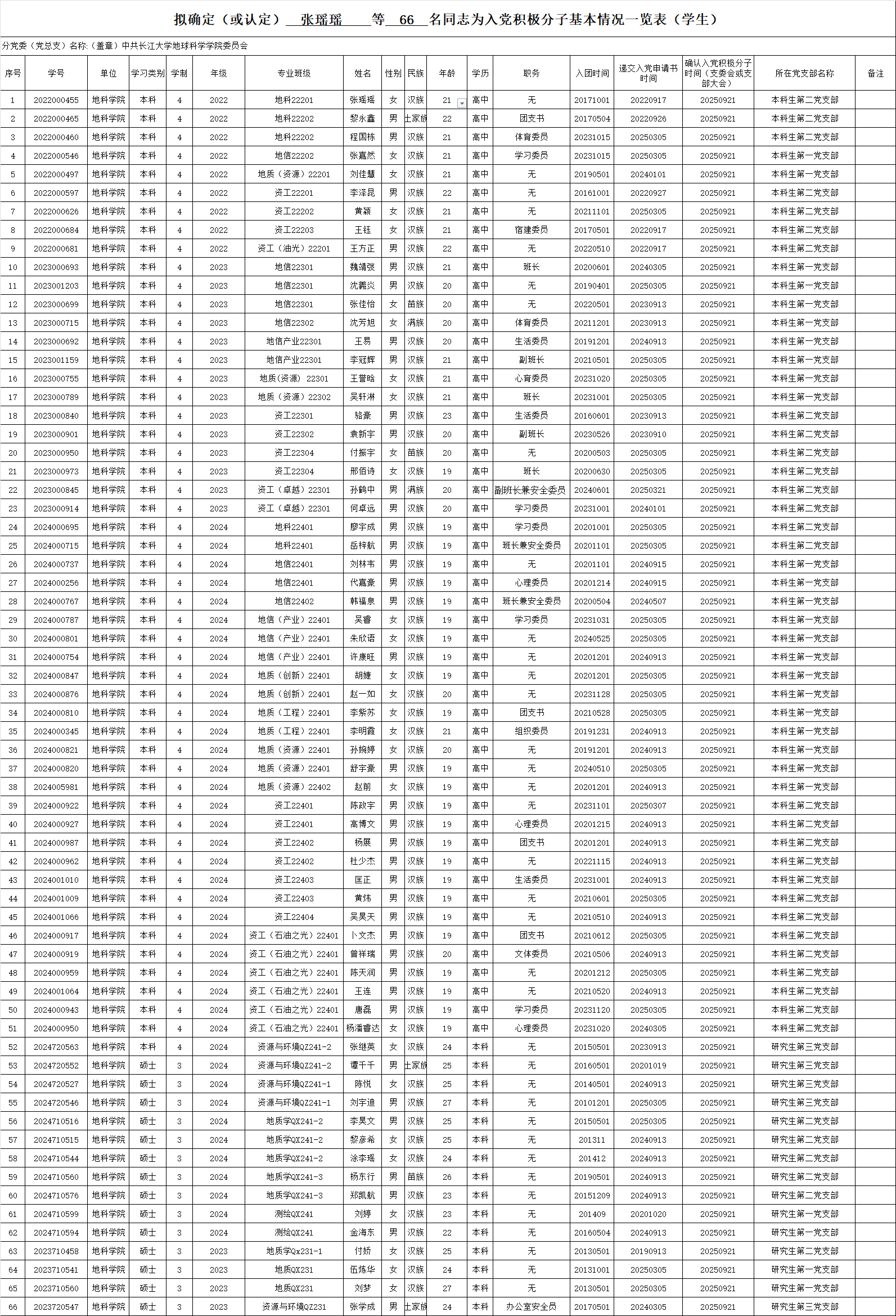 根据党员推荐和团组织推优情况,经支部委员会(不设支部委员会的由支部大会)会议讨论决定并报长江大学2138cn太阳集团党委备案,确定张瑶瑶等66名同学为入党积极分子,现予以公示。公示时间:2025年9月22日至2025年9月28日。 公示期间,党员和群众均可通过来信、来电、来访等形式反映公示对象在政治表现、道德品质、工作学习、遵纪守法和社会公德及廉洁自律等方面存在的问题和情况。反映问题应当实事求是、客观公正,反对借机诽谤诬告。以个人名义反映问题的,提倡署报本人真实姓名,以便调查核实,党支部将对反映人信息将严格保密。 联系方式:027-69111930(姚老师) 附:拟确定张瑶瑶等66名同志为入党积极分子基本情况一览表 中共长江大学2138cn太阳集团委员会 2025年9月22日