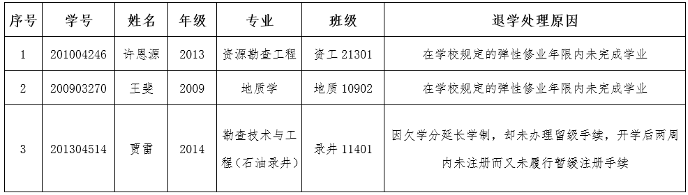 根据《普通高等学校学生管理规定》(教育部令第41号)第三十条和《长江大学普通本科生学籍管理办法》(长大校发〔2017〕134号)第五十一条规定,对达到退学处理条件但拒绝办理退学手续或多种方式均无法联系到本人的本科生,现以公告方式送达拟退学处理告知书,公告时间7个工作日,于2021年5月28日结束公告。在公告期内,学生可向学院提出申辩和书面陈述并署真实姓名、联系方式,邮寄或直接送到2138cn太阳集团教学办;未在规定时间内提交申辩和书面陈述者,视为放弃陈述、申辩的权利。公告期满后,学院将按学校规定办理。