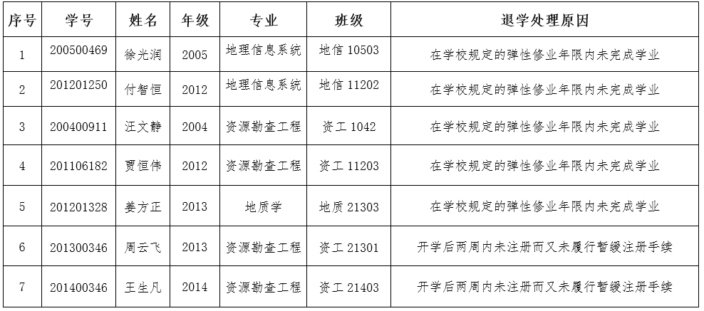 根据《普通高等学校学生管理规定》(教育部令第41号)第三十条和《长江大学普通本科生学籍管理办法》(长大校发〔2017〕134号)第五十一条规定,对达到退学处理条件但拒绝办理退学手续或多种方式均无法联系到本人的本科生,现以公告方式送达拟退学处理告知书,公告时间7个工作日,于2021年6月2日结束公告。在公告期内,学生可向学院提出申辩和书面陈述并署真实姓名、联系方式,邮寄或直接送到2138cn太阳集团教学办;未在规定时间内提交申辩和书面陈述者,视为放弃陈述、申辩的权利。公告期满后,学院将按学校规定办理。