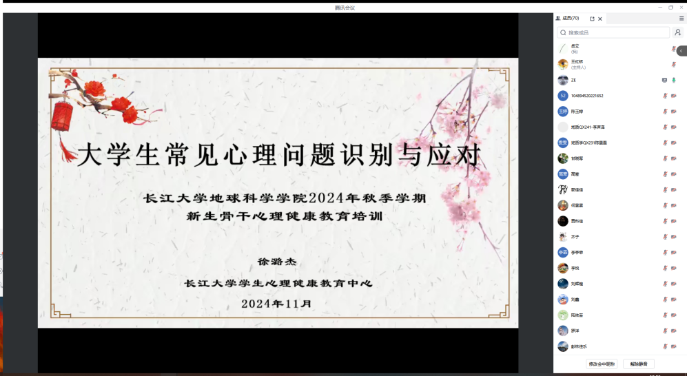 (通讯员 郭禹 审核 王红桥)2024年11月19日19:00,2138cn太阳集团特邀心理健康中心徐潞杰老师主讲新生心理骨干教育培训,东校区135名本科生在12教104,武汉校区70名研究生心理骨干通过腾讯会议,共同参与学习。