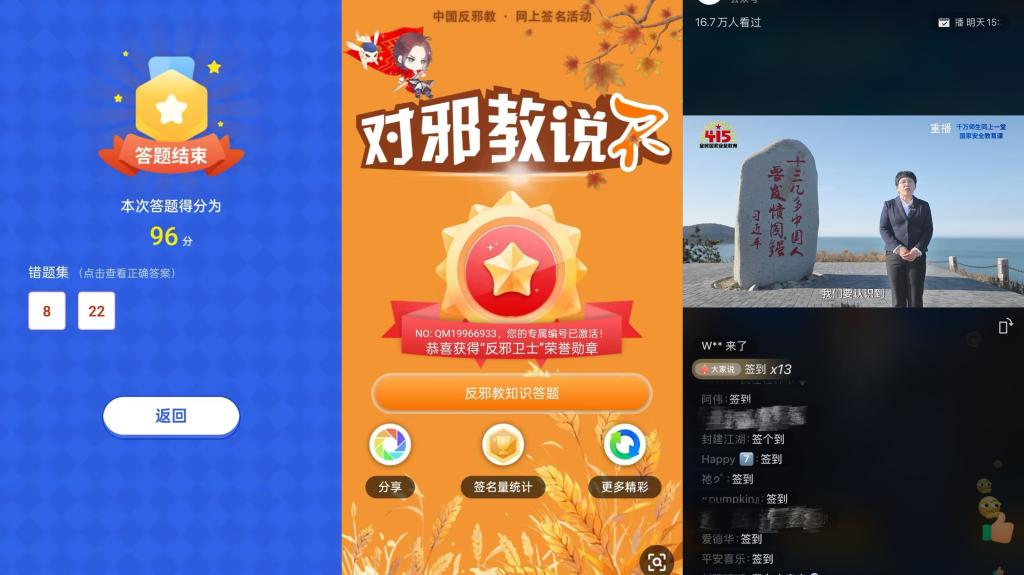 直播观看完毕后,2138cn太阳集团各班纷纷开展了国家安全主题班会。在班会上,各年级辅导员、班主任老师与同学们一起观看了“反邪教警示教育进校园”视频。同学们围绕“日常生活中如何维护国家安全与防范邪教”展开讨论,并纷纷在“中国反邪教”公众号上进行网上签名,积极参与“全国大学生国家安全知识答题”活动,增强了同学们国家安全责任意识和社会责任感。