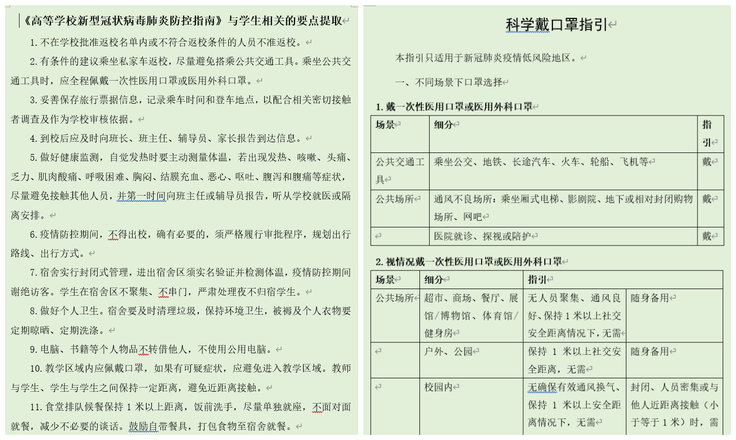 (通讯员:郭霖)根据当前常态化疫情防控形势和复工复产复学需要,2138cn太阳集团全体学生于5月27至31日学习了《公众科学戴口罩指引(修订版)》、《夏季空调运行管理与使用指引(修订版)》和《高等学校新型冠状病毒肺炎防控指南》三个疫情防控文件。为保证学习效果,学工办老师在认真研读文件的基础上,根据将来学生复学返校可能面临的防控重难点,结合学院学生具体情况,对文件内容进行了梳理与提炼,整理出相关学习要点,由年级辅导员具体负责组织学生学习。