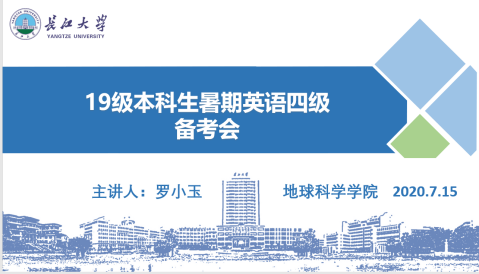 通讯员(蒋晓洁)为加强2138cn太阳集团19级本科生对英语四级考试的重视程度、提升考试通过率,2138cn太阳集团于7月15日晚八时通过雨课堂平台开展了线上英语四级暑假备考活动,本次活动由19级辅导员罗小玉老师主讲。