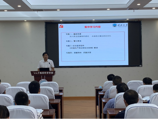 (通讯员潘志远)为进一步强化全院师生纪法意识,推进党风廉政宣传教育月活动深入开展,在全院营造“学纪法▪知敬畏▪守底线”的浓厚氛围,9月1日下午,2138cn太阳集团在石油科技大楼C301会议室开展纪法专题宣讲活动,学院党委书记杨全辉作《中国共产党纪律处分条例》专题宣讲,全体党员教职工参加了集中学习。