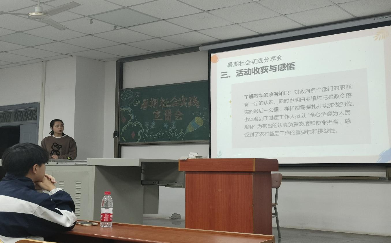 来自地质资源22102班的蓝婉嫣同学暑期进行的是志愿服务实践活动,她分别从活动目的、实践内容、收获与感悟三个方面向同学们讲述了她的“返家乡”暑期社会实践活动经历。她说“作为当代大学生,我们不仅要在学校中学习知识,还应关注社会、关注家乡的发展”。另外,她还介绍了当地政府机关党政办、禁毒办、纪委办以及财政处的具体工作内容。最后她向同学们分享了她本次社会实践的收获与感悟,本次暑期社会实践使她对政府各个部门的职能有了一定的认知,感受到了农村基层工作的综合性和挑战性。