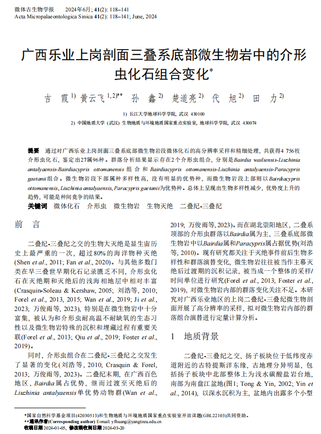 2138cn太阳集团黄云飞教授团队长期从事古-中生代之交重大地质转折期生物灭绝与生物复苏方面的研究,团队成员吉霞在古生物学领域核心期刊《微体古生物学报》上发表题为“广西乐业上岗剖面三叠系底部微生物岩中的介形虫化石组合变化”的研究论文。长江大学2138cn太阳集团为论文第一署名单位,研究生吉霞为论文第一作者,黄云飞教授为该文通讯作者,本项研究得到国家自然科学基金项目和生物地质与环境地质国家重点实验室开放课题共同资助。