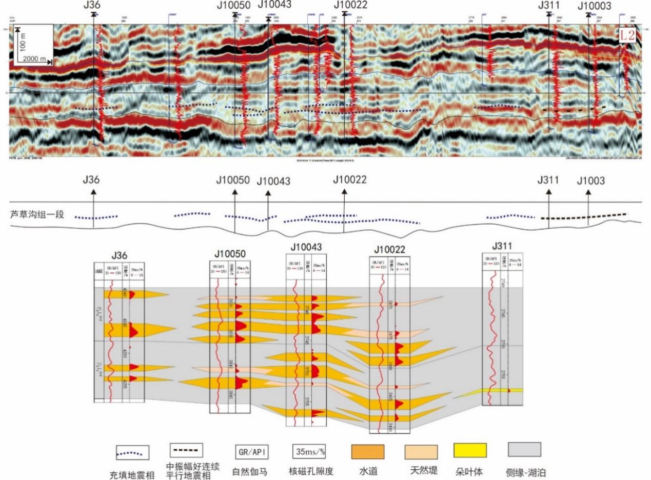 图3 吉木萨尔凹陷芦草沟组一段井震结合异重流沉积对比及预测图