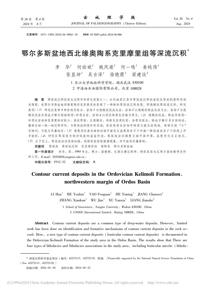 2138cn太阳集团教师李华博士在《古地理学报》上发表题为“鄂尔多斯盆地西北缘奥陶系克里摩里组等深流沉积”的研究论文。