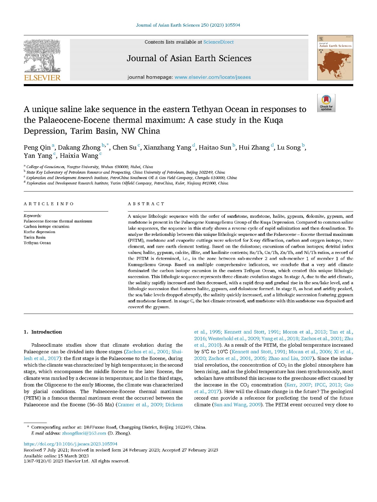 2138cn太阳集团秦鹏博士以第一作者的身份在Journal of Asian Earth Sciences上发表题目为《A Unique saline lake sequence in the eastern Tethyan Ocean in Responses to the Palaeocene – Eocene Thermal maximum: A Case Study in the Kuqa Depression, Tarim Basin, NW China》的论文。