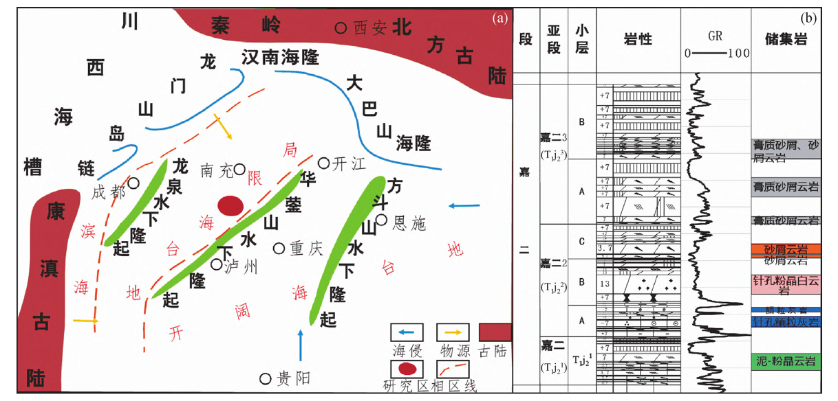 该研究选取了川中磨溪地区嘉二段碳酸盐岩储层为研究对象(图1),基于嘉二段孔隙结构差异,分为两部分(嘉二1与2A小层、嘉二2B和2C小层),通过对该地区岩心分析的分析的孔隙度、渗透率、压泵等资料来统计分析孔隙度、渗透率、饱和度参数之间的关系来确定储物层下限(图2、表1)。同时利用物性下限值的研究结果并结合对应孔渗数据探讨沉积与成岩等作用对储层的控制(图3)。研究结果表明研究区储层有效性主要受沉积微相和成岩作用的控制,沉积严格控制着储层的分布,成岩影响着原生孔隙的保留程度和次生孔隙的发育程度。
