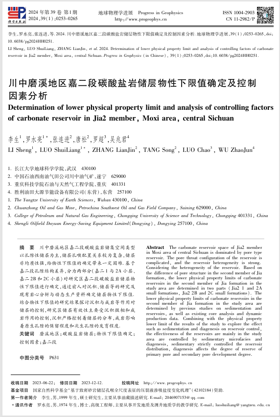 2138cn太阳集团石油系硕士生李生同学在2138cn太阳集团罗水亮副教授的指导下,在地球物理学领域期刊《地球物理学进展》上发表题为“川中磨溪地区嘉二段碳酸盐岩储层物性下限值确定及控制因素分析”的研究论文。