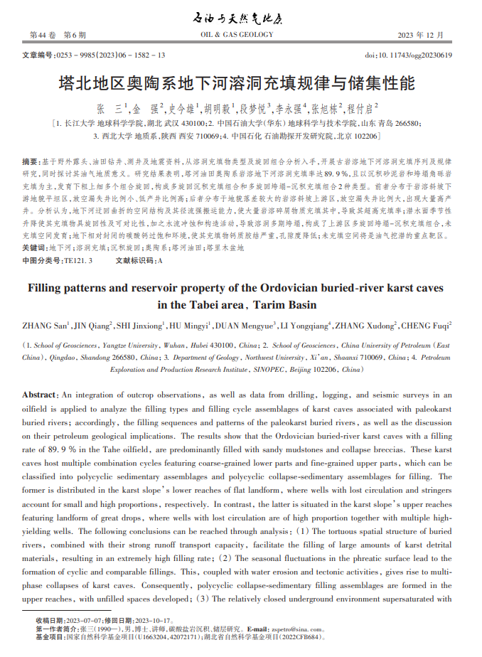 2138cn太阳集团地质系张三博士在《石油与天然气地质》期刊发表题为“塔北地区奥陶系地下河溶洞充填规律与储集性能”的研究论文。