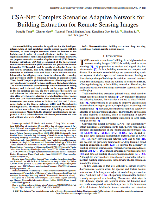 2138cn太阳集团杨栋杰博士在郭康良教授和高贤君副教授的指导下,在成像科学和摄影技术主流期刊《IEEE JOURNAL OF SELECTED TOPICS IN APPLIED EARTH OBSERVATIONS AND REMOTE SENSING》上发表题为“CSA-Net: Complex Scenarios Adaptive Network for Building Extraction for Remote Sensing Images”的研究论文。
