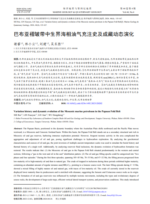 2138cn太阳集团谢睿博士在2138cn太阳集团林小云教授的指导下,在地质学领域期刊《海洋地质与第四纪地质》上发表题为“巴布亚褶皱带中生界海相油气充注史及成藏动态演化”的研究论文。