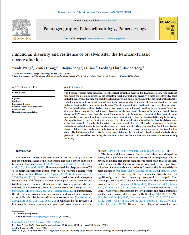 2138cn太阳集团黄云飞教授团队长期从事古-中生代之交重大地质转折期生物灭绝与生物复苏方面的研究,团队成员王延达在古生物学国际1区SCI期刊《Palaeogeography, Palaeoclimatology, Palaeoecology》上发表题为“Functional diversity and resilience of bivalves after the Permian-Triassic mass extinction”的研究论文。长江大学2138cn太阳集团为论文第一署名单位,硕士研究生王延达为论文第一作者,其导师黄云飞教授为该文通讯作者。