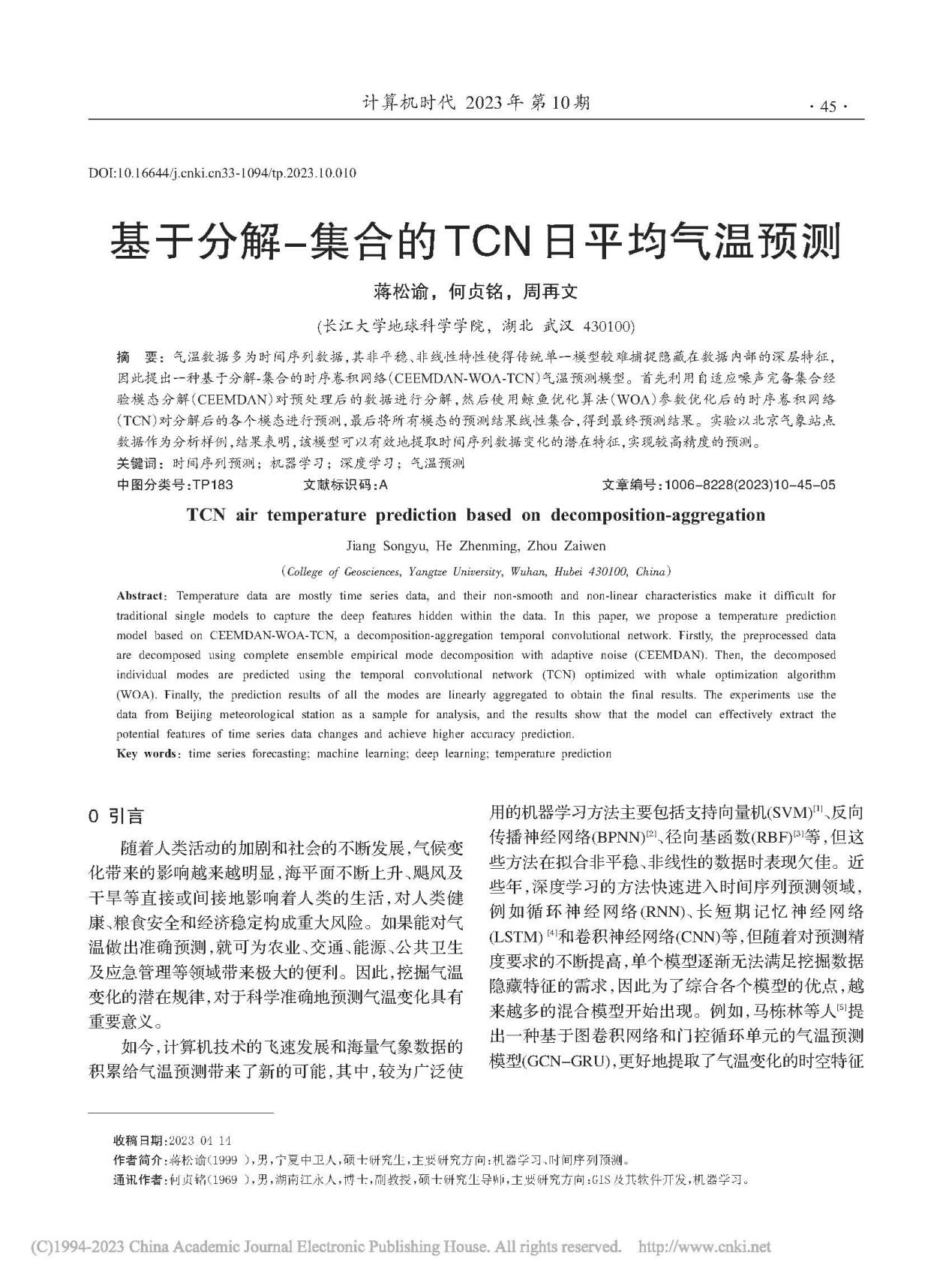 2138cn太阳集团何贞铭副教授团队长期从事GIS、RS应用的研究,团队成员蒋松渝在期刊《计算机时代》上发表题为“基于分解-集合的TCN日平均气温预测”的研究论文。长江大学2138cn太阳集团为论文第一署名单位,硕士研究生蒋松渝为论文第一作者,其导师何贞铭副教授为该文通讯作者。