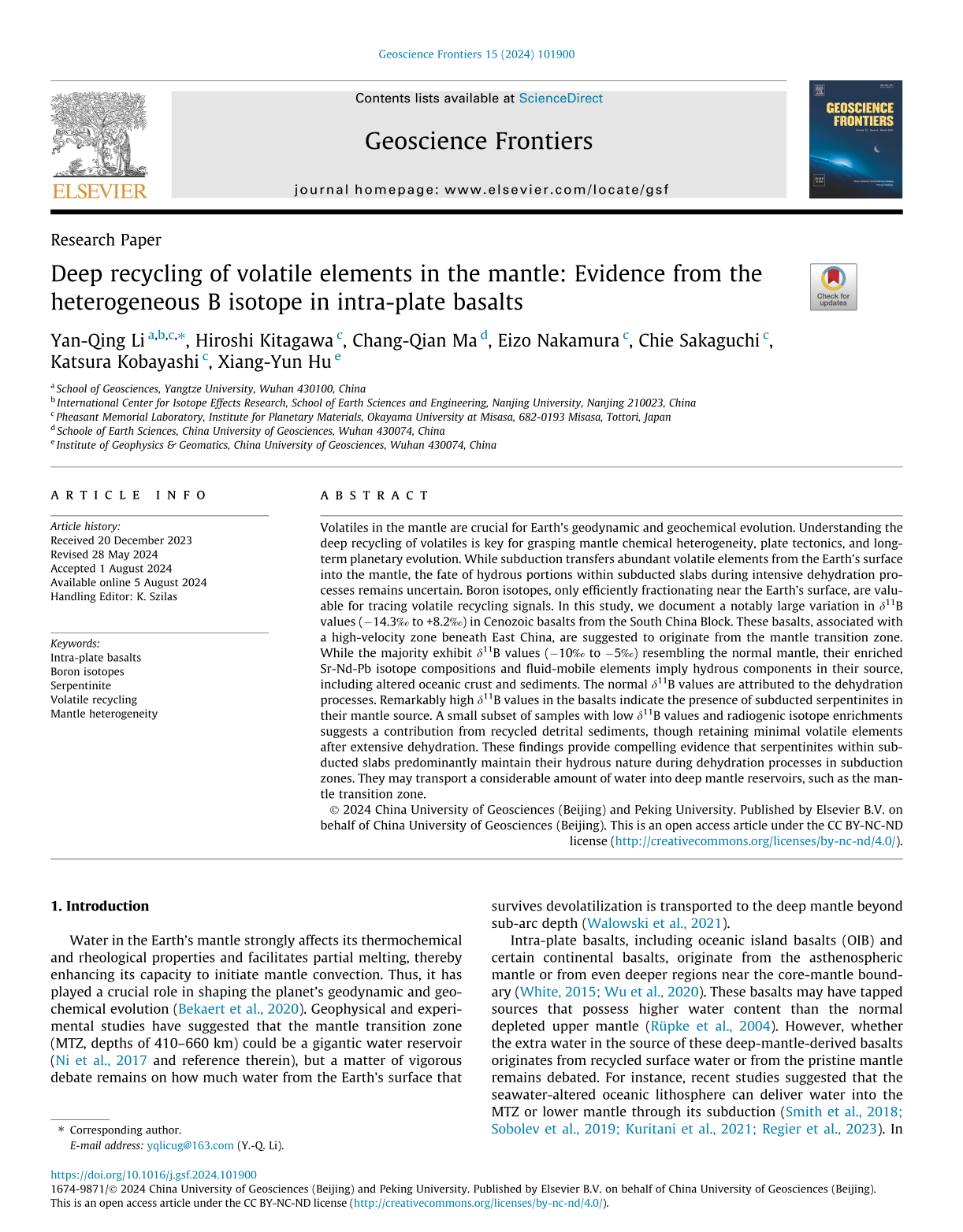 2138cn太阳集团地科系教师李艳青在期刊《Geoscience Frontiers》上发表题为《Deep recycling of volatile elements in the mantle: Evidence from the heterogeneous B isotope in intra-plate basalts》的研究论文。
