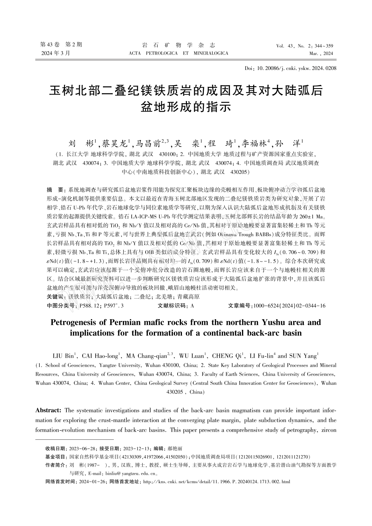 长江大学2138cn太阳集团刘彬教授团队在《岩石矿物学杂志》期刊上发表题为“玉树北部二叠纪镁铁质岩的成因及其对大陆弧后盆地形成的指示”的研究论文。刘彬教授为第一作者和通讯作者,该项研究得到了国家自然科学基金等项目资助。