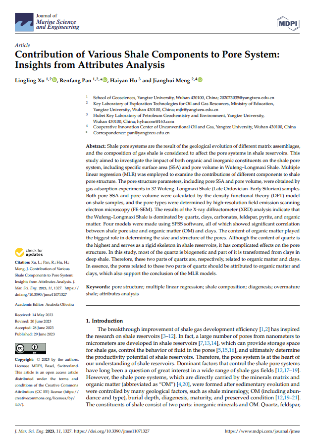 2138cn太阳集团石油系潘仁芳教授在海洋地质学领域主流期刊《Journal of Marine Science and Engineering》(JMSE)上发表题为“Contribution of Various Shale Components to Pore System: Insights from Attributes Analysis”的研究论文。