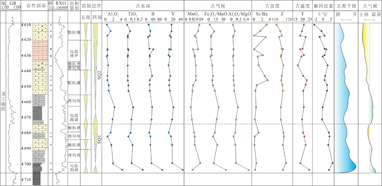 图1 川中地区某钻井龙王庙组高频层序对古气候和古海平面变化的响应综合柱状图