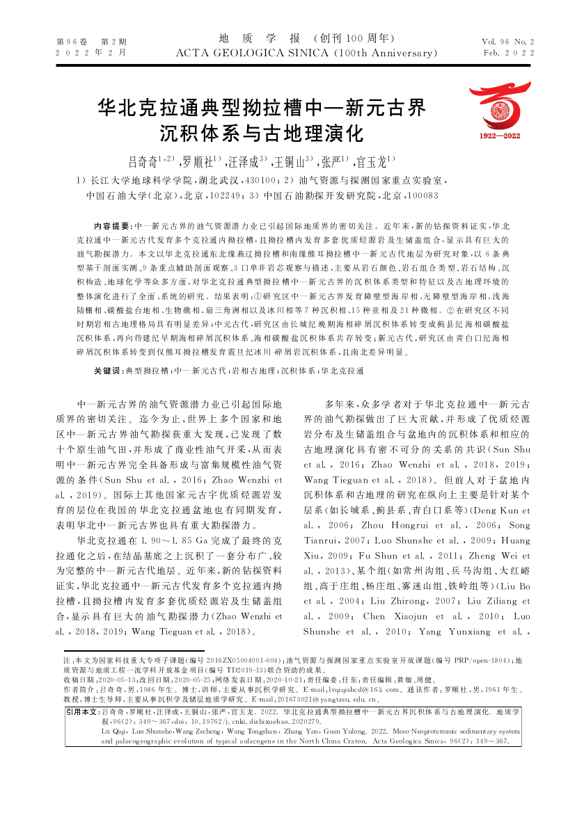 2138cn太阳集团教师吕奇奇副教授以第一作者身份在石油领域重要期刊《地质学报》发表题为《华北克拉通典型拗拉槽中—新元古界沉积体系与古地理演化》的研究论文,该项研究得到了国家科技重大专项子课题、油气资源与探测国家重点实验室开放课题和地质资源与地质工程一流学科开放基金项目的资助。