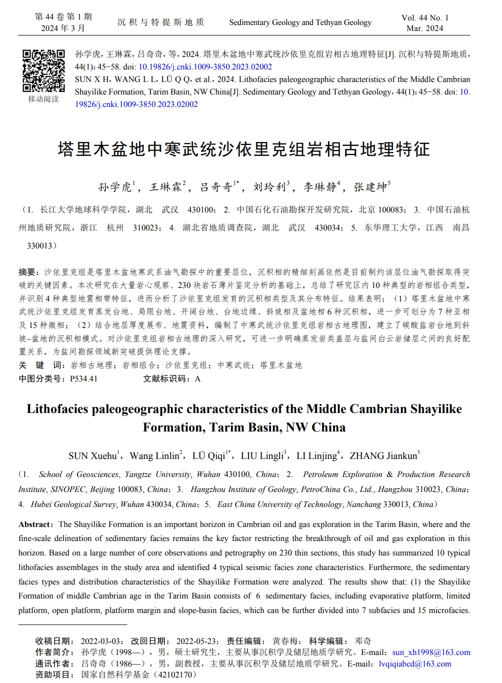 2138cn太阳集团硕士生孙学虎在《沉积与特提斯地质》上发表了题为“塔里木盆地中寒武统沙依里克组岩相古地理特征”的研究论文,采用岩相学、沉积学的方法,分析了塔塔里木盆地沙依里克组岩相古地理过程。长江大学为论文第一署名单位,孙学虎为第一作者,导师吕奇奇副教授为通讯作者。