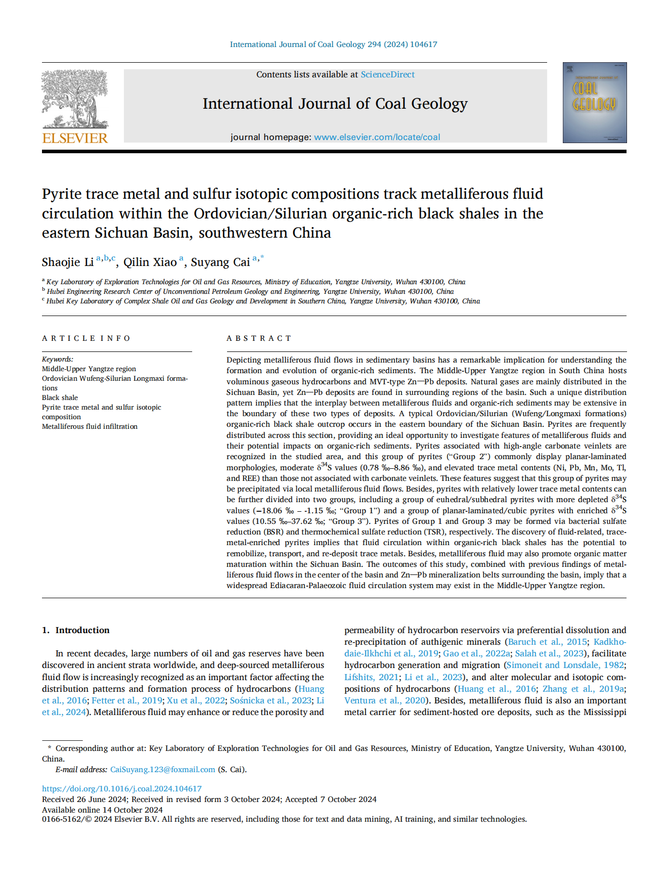 2138cn太阳集团石油系李劭杰在煤田地质学领域主流国际SCI期刊《International Journal of Coal Geology》上发表题为“Pyrite trace metal and sulfur isotopic compositions track metalliferous fluid circulation within the Ordovician/Silurian organic-rich black shales in the eastern Sichuan Basin, southwestern China”的研究论文。